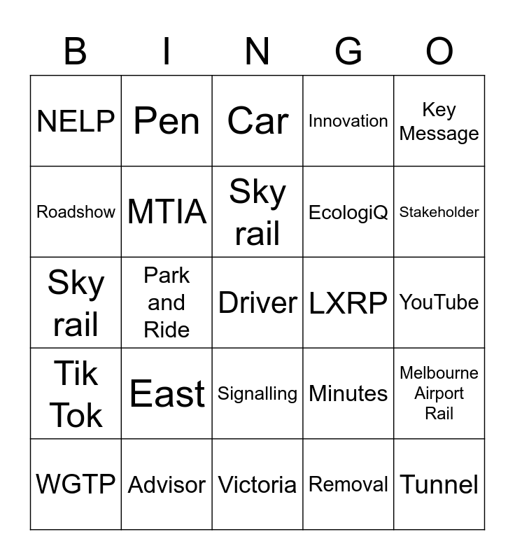 This bingo card has 1 images and 84 words: Free!, Train, Car, Metro, Regional, Tram, VLine, PTV, Disruption, Digi, Fast Facts, Style Guide, MTIA, LXRP, RPV, NELP, WGTP, Roadshow, Community, Bus, SRL, EcologiQ, Driver, Freeway, Park and Ride, Motorbike, Grain Train, Metro Tunnel, Cycling, North, East, North, South, Sky rail, Tunnel, Trench, Victoria, Resident, Stakeholder, Tik Tok, Article, Newsletter, Works Notice, Speech, Meeting Minutes, Hi-Vis, Pen, LinkedIn, Instagram, Premier, Training, Minutes, Innovation, Coffee, Procurement, Victoria, Advisor, Sky rail, Facebook, YouTube, Exhibition Street, Lonsdale Street, Parliament, Alliance, Approvals, Open Space, Big Build, Carpark, Key Message, Melbourne, Melbourne Airport Rail, Regional Rail Revival, Geelong Fast Rail, Bridge, Signalling, Removal, Upgrade, Collateral, ODG, Big Build, Networking, Pen, Meeting and Minister.