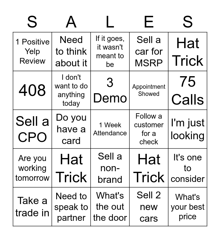 This bingo card has a free space and 24 words: Hat Trick, Need to speak to partner, 3 Demo, Take a trade in, Hat Trick, 1 Positive Yelp Review, 408, Need to think about it, Follow a customer for a check, Sell a non-brand, Appointment Showed, Sell a CPO, Hat Trick, It's one to consider, I don't want to do anything today, Sell 2 new cars, I'm just looking, If it goes, it wasn't meant to be, 75 Calls, Do you have a card, What's your best price, Are you working tomorrow, Sell a car for MSRP and What's the out the door.