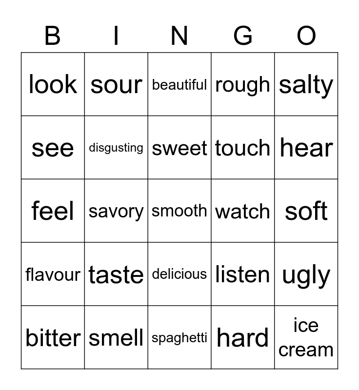 This bingo card has a free space and 24 words: taste, smell, sweet, bitter, salty, look, see, sour, watch, delicious, touch, feel, listen, ugly, disgusting, hard, soft, beautiful, hear, savory, ice cream, flavour, rough and spaghetti.