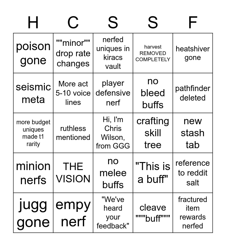 This bingo card has a free space and 24 words: THE VISION, empy nerf, player defensive nerf, jugg gone, heatshiver gone, poison gone, seismic meta, ""minor"" drop rate changes, crafting skill tree, no melee buffs, no bleed buffs, more budget uniques made t1 rarity, "This is a buff", reference to reddit salt, More act 5-10 voice lines, cleave """buff""", new stash tab, nerfed uniques in kiracs vault, pathfinder deleted, ruthless mentioned, fractured item rewards nerfed, minion nerfs, harvest REMOVED COMPLETELY and "We've heard your feedback".