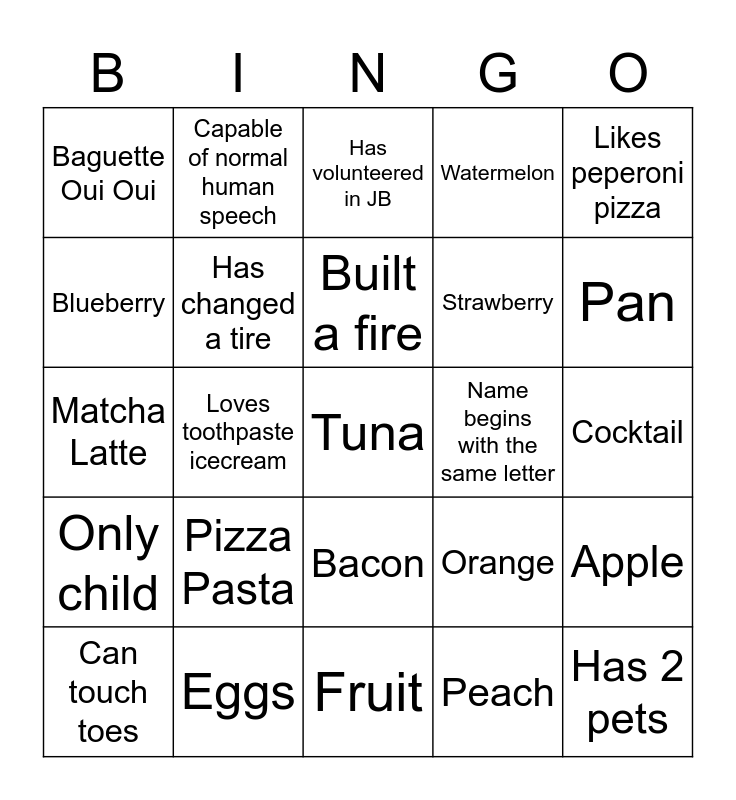 This bingo card has 33 words: Has 2 pets, Skipped an online PBL, Loves toothpaste icecream, Scuba dives, Only child, Has changed a tire, Likes peperoni pizza, Can touch toes, Capable of normal human speech, Same birthday month, Built a fire, Has volunteered in JB, Pear, Likes Microbiology, Name begins with the same letter, Pan, Eggs, Matcha Latte, Pizza Pasta, Orange, Bacon, Coffee, Baguette Oui Oui, Cocktail, Fruit, Tuna, Watermelon, Strawberry, Blueberry, Apple, Plum, Peach and Mackerel.