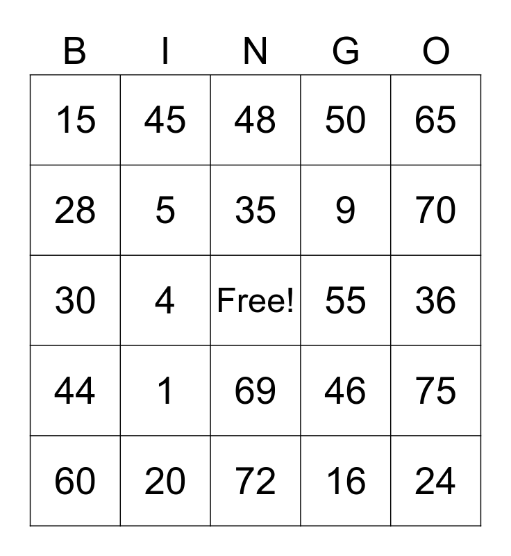 This bingo card has a free space and 24 words: 1, 20, 35, 60, 65, 15, 28, 45, 55, 69, 9, 30, 46, 75, 5, 16, 36, 48, 70, 4, 24, 44, 50 and 72.
