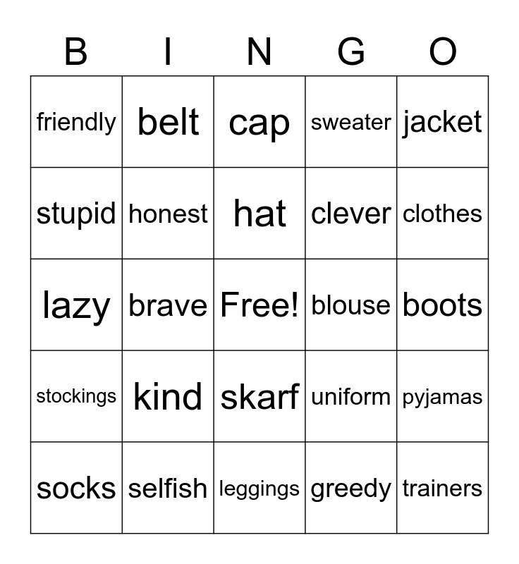 This bingo card has a free space and 24 words: kind, selfish, hat, socks, jacket, friendly, stupid, belt, blouse, skarf, clever, lazy, uniform, pyjamas, honest, greedy, boots, cap, clothes, brave, trainers, stockings, sweater and leggings.