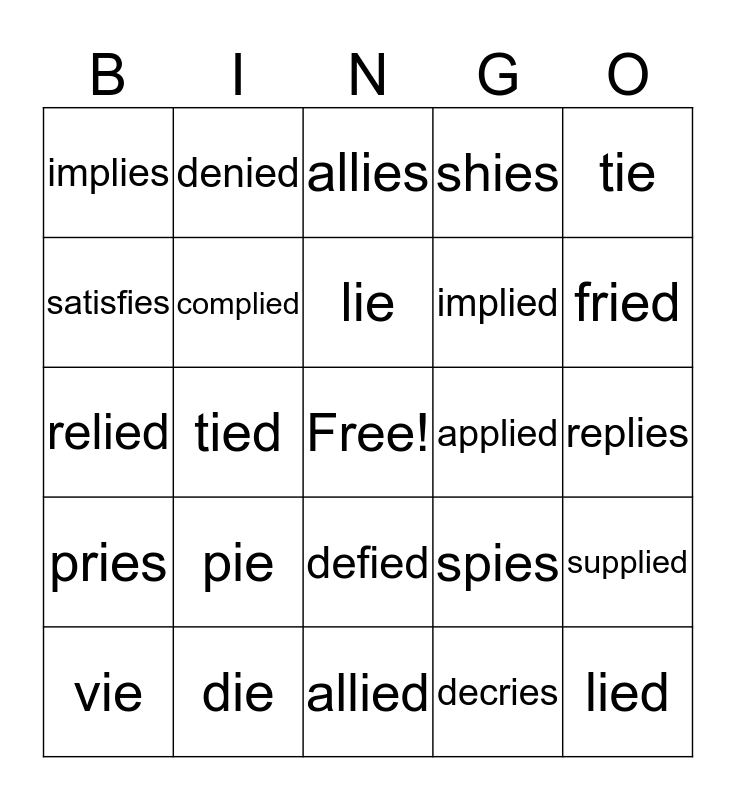 This bingo card has a free space and 24 words: pie, die, lie, vie, tie, implies, satisfies, denied, applied, defied, implied, relied, spies, supplied, complied, decries, replies, allies, fried, tied, lied, pries, shies and allied.