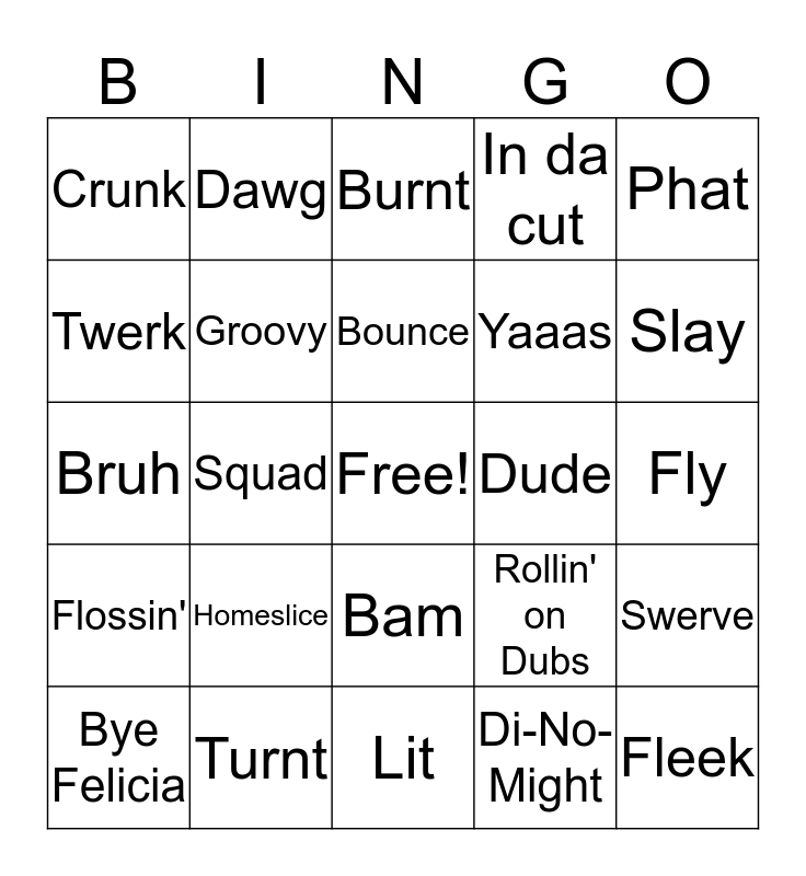 This bingo card has a free space and 24 words: Homeslice, Turnt, Bounce, Bye Felicia, Phat, Crunk, Twerk, Dawg, Dude, Bam, Yaaas, Bruh, Rollin' on Dubs, Swerve, Groovy, Di-No-Might, Fly, Burnt, Slay, Squad, Fleek, Flossin', In da cut and Lit.