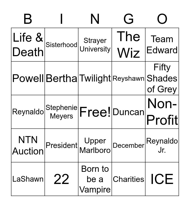 This bingo card has a free space and 24 words: President, 22, Twilight, LaShawn, Team Edward, Life & Death, Powell, Sisterhood, Duncan, Upper Marlboro, Reyshawn, Reynaldo, December, Reynaldo Jr., Bertha, Charities, Non-Profit, Strayer University, Fifty Shades of Grey, Stephenie Meyers, ICE, NTN Auction, The Wiz and Born to be a Vampire.