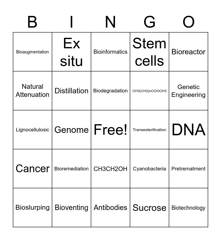 This bingo card has a free space and 24 words: Bioremediation, Bioventing, Biodegradation, Bioslurping, Bioreactor, Bioaugmentation, Natural Attenuation, Ex situ, Transesterification, CH3CH2OH, CH3(CH2)nCOOCH3, Lignocellulosic, Cyanobacteria, Pretrematment, Distillation, Sucrose, DNA, Bioinformatics, Genetic Engineering, Genome, Biotechnology, Cancer, Stem cells and Antibodies.