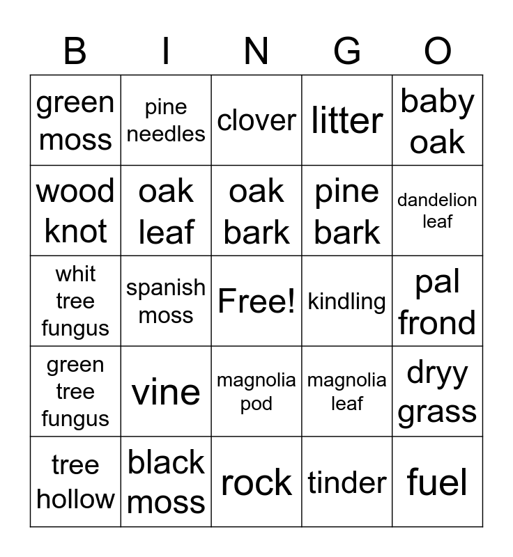 This bingo card has a free space and 24 words: vine, black moss, oak bark, tree hollow, baby oak, green moss, wood knot, pine needles, kindling, magnolia pod, pine bark, whit tree fungus, magnolia leaf, dryy grass, oak leaf, tinder, pal frond, clover, dandelion leaf, spanish moss, fuel, green tree fungus, litter and rock.