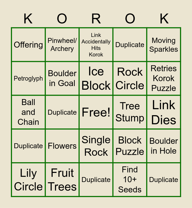 This bingo card has a free space and 24 words: Flowers, Fruit Trees, Ice Block, Lily Circle, Moving Sparkles, Offering, Petroglyph, Pinwheel/ Archery, Tree Stump, Single Rock, Rock Circle, Ball and Chain, Block Puzzle, Boulder in Hole, Boulder in Goal, Find 10+ Seeds, Link Dies, Link Accidentally Hits Korok, Retries Korok Puzzle, Duplicate, Duplicate, Duplicate, Duplicate and Duplicate.