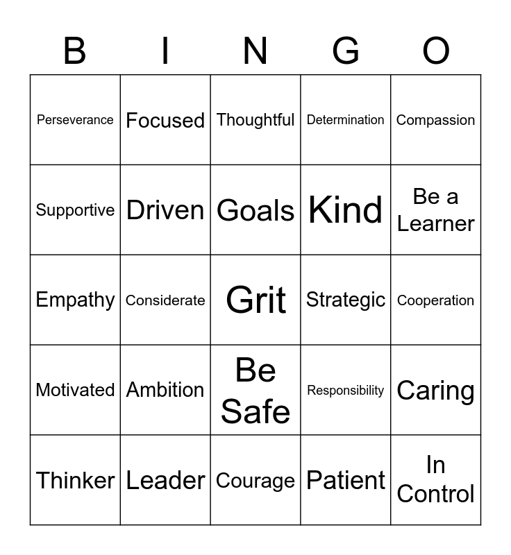 This bingo card has 33 words: Be Respectful, Be Responsible, Be Safe, Be Proud, Be a Learner, Perseverance, Considerate, Courage, Determination, Helpful, Supportive, Focused, Encouraging, Patient, Compassion, Empathy, Ambition, Grit, Responsibility, Cooperation, Thinker, Problem Solver, Thoughtful, Strategic, In Control, Motivated, Driven, Goals, Kind, Caring, Positive, Leader and Successful.