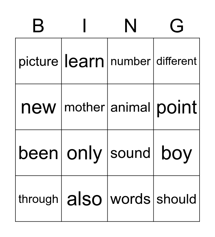 This bingo card has 16 words: also, boy, number, picture, been, learn, sound, words, new, mother, through, different, only, point, animal and should.