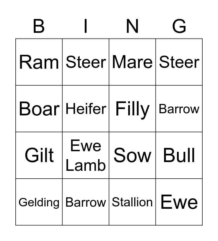 This bingo card has 19 words: Sow, Cow, Mare, Ewe, Bull, Boar, Stallion, Ram, Steer, Gilt, Ewe Lamb, Heifer, Filly, Barrow, Gelding, Weather, Steer, Barrow and Gelding.