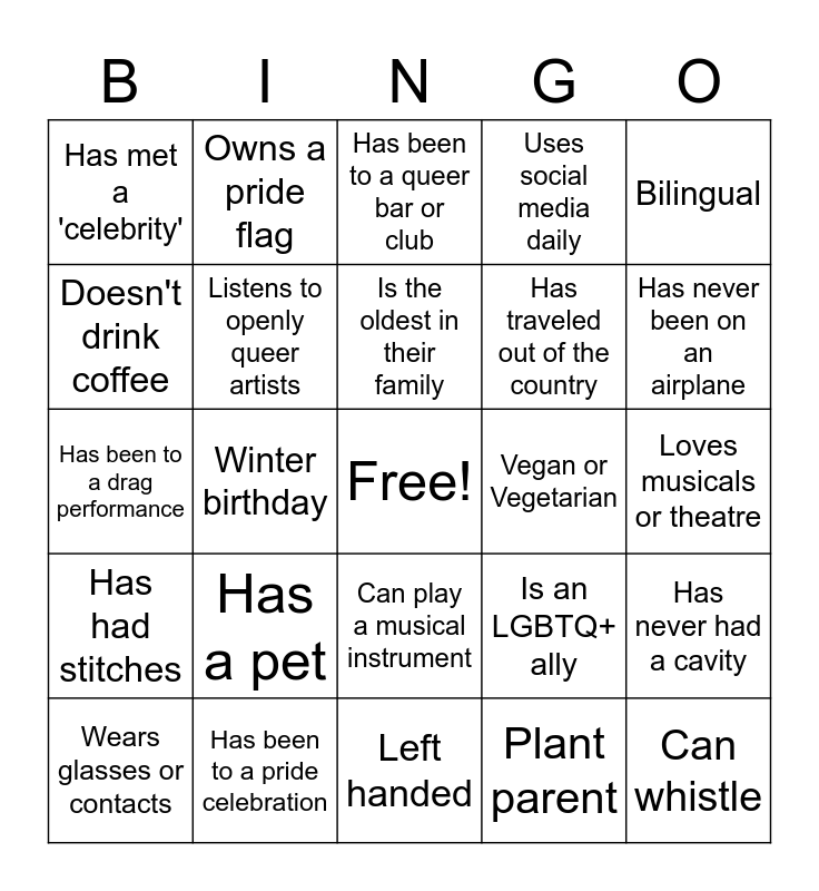 This bingo card has a free space and 24 words: Has a pet, Has been to a pride celebration, Is the oldest in their family, Wears glasses or contacts, Bilingual, Has met a 'celebrity', Doesn't drink coffee, Owns a pride flag, Vegan or Vegetarian, Can play a musical instrument, Has traveled out of the country, Has been to a drag performance, Is an LGBTQ+ ally, Has never had a cavity, Listens to openly queer artists, Plant parent, Loves musicals or theatre, Has been to a queer bar or club, Has never been on an airplane, Winter birthday, Can whistle, Has had stitches, Uses social media daily and Left handed.