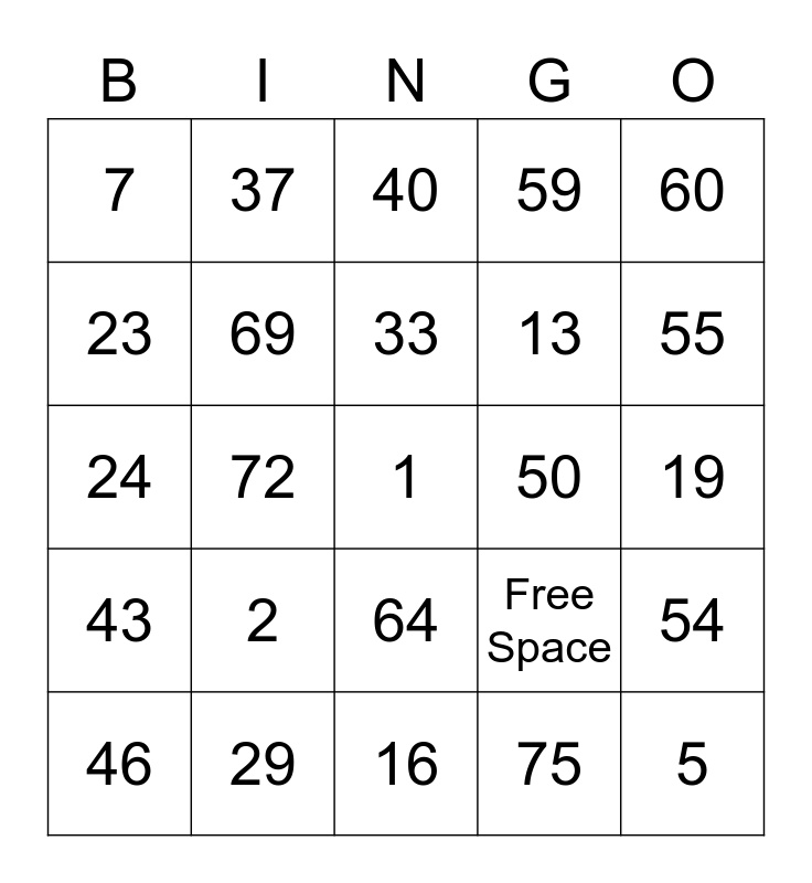 This bingo card has 25 words: 2, 16, 33, 46, 60, 7, 23, 37, 50, 64, 13, 24, Free Space, 54, 69, 5, 19, 40, 55, 72, 1, 29, 43, 59 and 75.