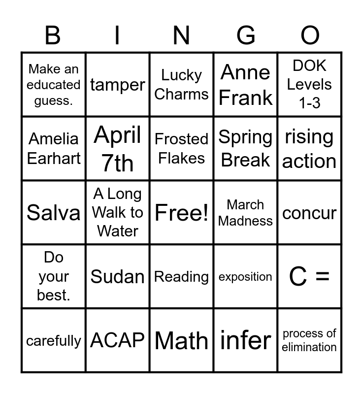 This bingo card has a free space and 62 words: March, ACAP, Levels 3-4, Do your best., goal, April 1st, April 7th, spring, Spring Break, Helen Keller, Anne Frank, Rosa Parks, Amelia Earhart, Sandra Day O'Connor, Harriet Tubman, Make an educated guess., process of elimination, DOK Levels 1-3, faculty, Frosted Flakes, March Madness, Lucky Charms, carefully, infer, imagery, A.E.C., A =, E =, C =, 2, textual evidence, Scream, paragraph format, resume, concur, tamper, VOID, akin, A Long Walk to Water, Nya, Salva, Dinka, Sudan, barn, rising action, exposition, simile, dangling and misplaced modifiers, Ms. Mitchelll & Ms. Bowens, Ms. Sumerlin, Ms. Tapia, & Ms. Powell, Reading, Math, Science, Easter, St. Patrick’s Day, Pi Day, metaphor, personification, YOU, rebels & the war, Mr. Jackson and WATER.