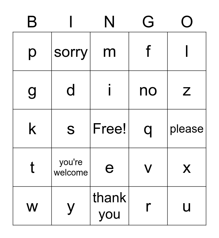 This bingo card has a free space and 35 words: a, b, c, d, e, f, g, h, i, j, k, l, n, o, p, q, r, s, t, u, v, w, x, y, m, z, hello, yes, no, please, goodbye, thank you, you're welcome, sorry and good to see you.
