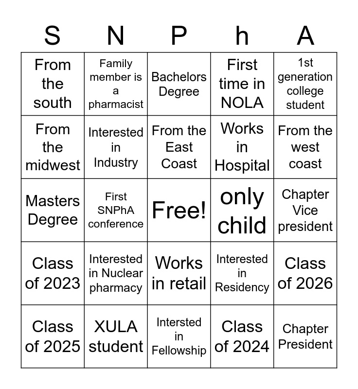This bingo card has a free space and 24 words: Interested in Nuclear pharmacy, XULA student, From the East Coast, Class of 2025, 1st generation college student, From the south, From the midwest, Family member is a pharmacist, only child, Works in retail, Works in Hospital, Masters Degree, Interested in Residency, Class of 2026, Interested in Industry, Class of 2024, Chapter Vice president, Bachelors Degree, From the west coast, First SNPhA conference, Chapter President, Class of 2023, First time in NOLA and Intersted in Fellowship.