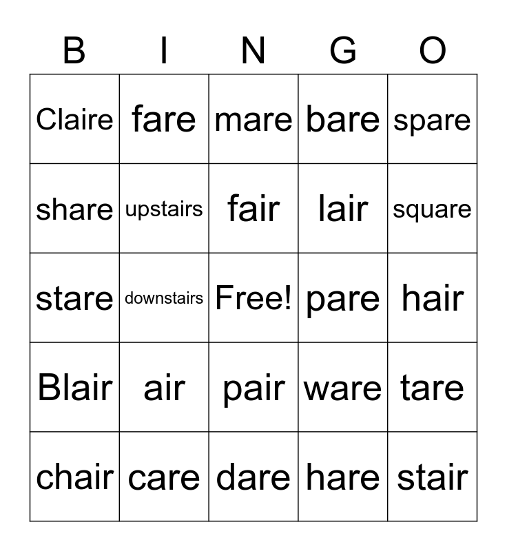 This bingo card has a free space and 24 words: air, care, fair, chair, spare, Claire, share, fare, pare, pair, lair, stare, ware, tare, upstairs, hare, hair, mare, square, downstairs, stair, Blair, bare and dare.