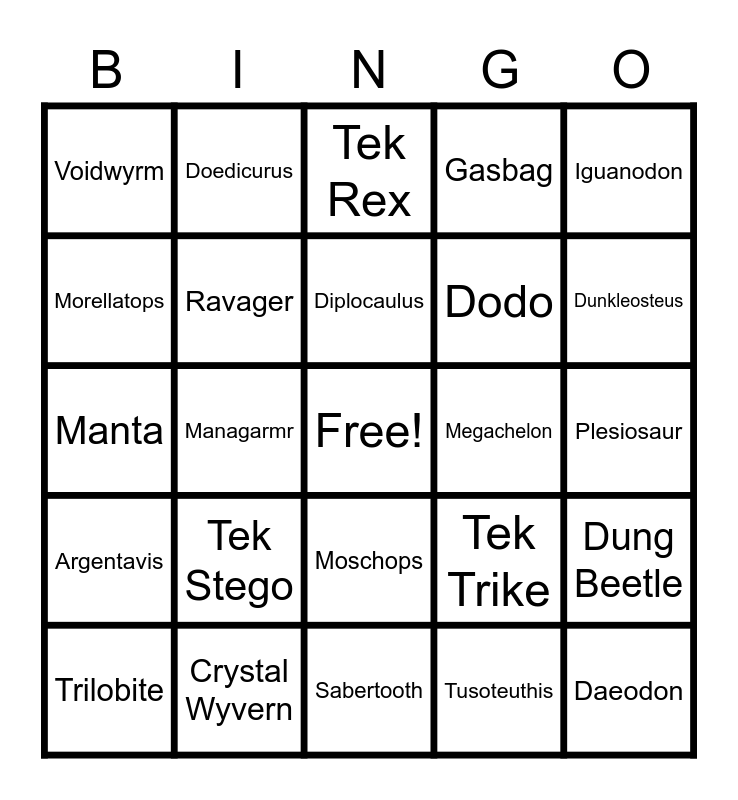 This bingo card has a free space and 132 words: Achatina, Allosaurus, Anglerfish, Ankylosaurus, Araneo, Archaeopteryx, Argentavis, Arthropleura, Baryonyx, Basilisk, Basilosaurus, Beelzebufo, Bloodstalker, Brontosaurus, Bulbdog, Carbonemys, Carnotaurus, Castoroides, Chalicotherium, Coelacanth, Compy, Crystal Wyvern, Daeodon, Dilophosaurus, Dimetrodon, Dimorphodon, Diplocaulus, Diplodocus, Direbear, Direwolf, Dodo, Doedicurus, Dung Beetle, Dunkleosteus, Electrophorus, Equus, Featherlight, Ferox, Gacha, Gallimimus, Gasbag, Giant Bee, Giganotosaurus, Gigantopithecus, Glowtail, Griffin, Hesperornis, Hyaenodon, Ichthyosaurus, Iguanodon, Jerboa, Kairuku, Kaprosuchus, Karkinos, Kentrosaurus, Liopleurodon, Lymantria, Lystrosaurus, Mammoth, Managarmr, Manta, Mantis, Megalania, Megaloceros, Megalodon, Megalosaurus, Megatherium, Mesopithecus, Microraptor, Morellatops, Mosasaurus, Moschops, Onyc, Otter, Oviraptor, Ovis, Pachy, Pachyrhinosaurus, Paraceratherium, Parasaur, Pegomastax, Pelagornis, Phiomia, Plesiosaur, Procoptodon, Pteranodon, Pulmonoscorpius, Purlovia, Quetzal, Raptor, Ravager, Rex, Rock Elemental, Sabertooth, Sarco, Shinehorn, Snow Owl, Spinosaur, Stegosaurus, Tapejara, Tek Rex, Tek Trike, Tek Stego, Terror Bird, Therizinosaur, Thorny Dragon, Thylacoleo, Titanoboa, Triceratops, Troodon, Tropeognathus, Tusoteuthis, Unicorn, Velonasaur, Vulture, Wooly Rhinoceros, Yutyrannus, Roll Rat, Shadowmane, Astrocetis, Astrodelphis, Maewing, Noglin, Voidwyrm, Phoenix, Megachelon, Trilobite, carcha, fjordhawk, fenrir, desmo and andrewsarchus.