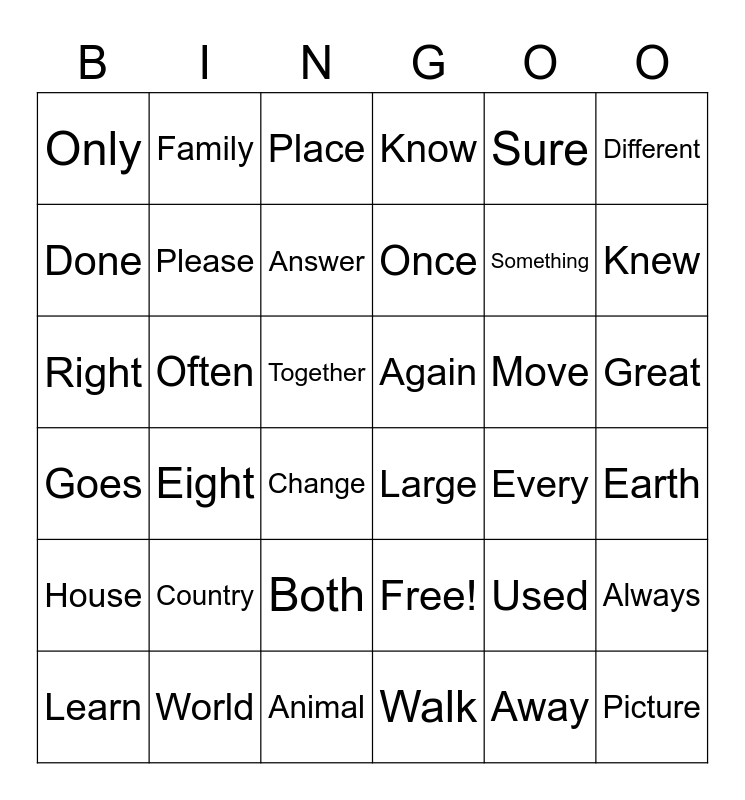 This bingo card has 36 words: Free!, Both, Walk, Done, Goes, Again, Please, Animal, Sure, Used, Knew, Know, Always, Often, Once, Only, House, Move, Right, Place, Together, Eight, Large, Change, Every, Family, Something, World, Answer, Different, Picture, Learn, Earth, Great, Country and Away.