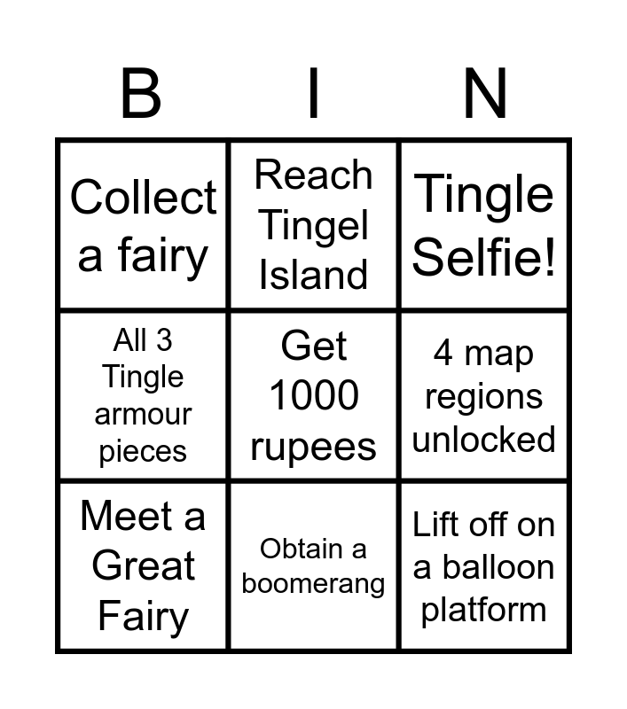 This bingo card has 9 words: Meet a Great Fairy, Tingle Selfie!, Reach Tingel Island, All 3 Tingle armour pieces, Collect a fairy, 4 map regions unlocked, Get 1000 rupees, Lift off on a balloon platform and Obtain a boomerang.