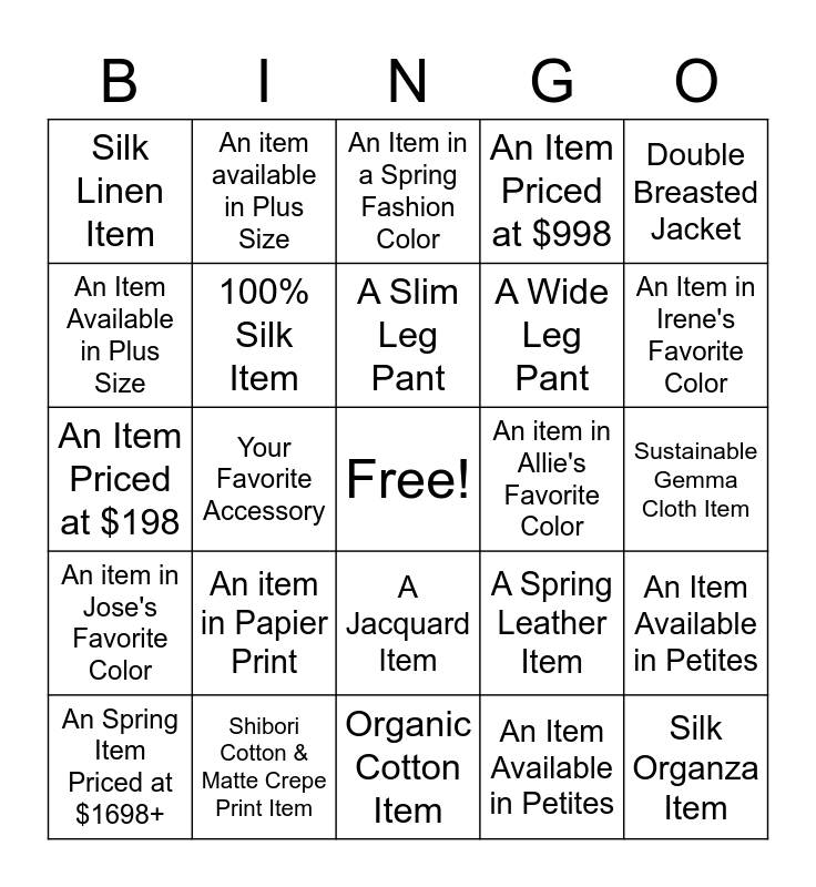 This bingo card has a free space and 24 words: An Spring Item Priced at $1698+, An item in Papier Print, A Slim Leg Pant, An Item Available in Petites, Double Breasted Jacket, Silk Linen Item, An item available in Plus Size, An Item in a Spring Fashion Color, An item in Allie's Favorite Color, Sustainable Gemma Cloth Item, An Item Priced at $198, 100% Silk Item, A Spring Leather Item, An Item Available in Petites, An Item Available in Plus Size, Shibori Cotton & Matte Crepe Print Item, Organic Cotton Item, An Item Priced at $998, An Item in Irene's Favorite Color, An item in Jose's Favorite Color, Your Favorite Accessory, A Jacquard Item, A Wide Leg Pant and Silk Organza Item.