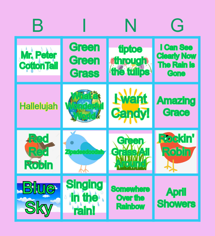 This bingo card has 10 images and 16 words: Singing in the rain!, Rockin' Robin, tiptoe through the tulips, Mr. Peter CottonTail, Red Red Robin, Green Green Grass, Green Grass All Around, Somewhere Over the Rainbow, Hallelujah, What a Wonderful World, Blue Sky, I Can See Clearly Now The Rain is Gone, Zipadeedoodah, Amazing Grace, I want Candy! and April Showers.