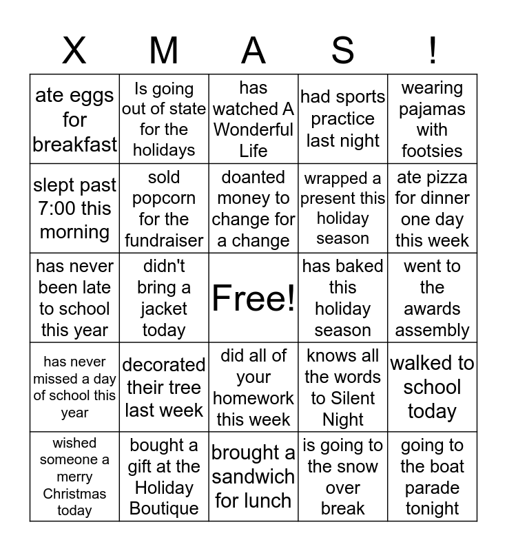 This bingo card has a free space and 24 words: decorated their tree last week, bought a gift at the Holiday Boutique, doanted money to change for a change, wished someone a merry Christmas today, wearing pajamas with footsies, ate eggs for breakfast, slept past 7:00 this morning, Is going out of state for the holidays, has baked this holiday season, did all of your homework this week, wrapped a present this holiday season, has never been late to school this year, knows all the words to Silent Night, walked to school today, sold popcorn for the fundraiser, is going to the snow over break, went to the awards assembly, has watched A Wonderful Life, ate pizza for dinner one day this week, didn't bring a jacket today, going to the boat parade tonight, has never missed a day of school this year, had sports practice last night and brought a sandwich for lunch.