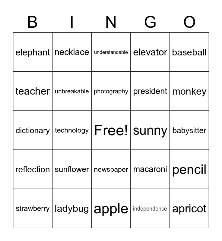 This bingo card has a free space and 33 words: farmer, handwriting, technology, student, reflection, unbreakable, baseball, strawberry, necklace, computer, photography, understandable, kitten, window, sunny, monkey, ladybug, dictionary, sunflower, macaroni, newspaper, ballerina, elephant, babysitter, apple, apricot, elevator, president, teacher, pencil, basketball, independence and procrastination.