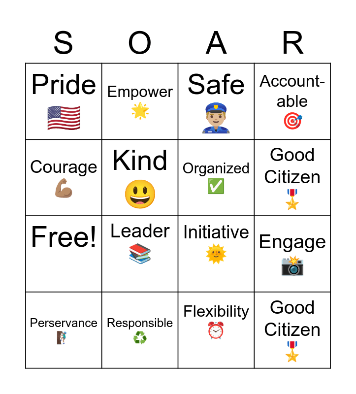 This bingo card has 20 words: Engage 📸, Eagles 🦅, Safe 👮🏼♂️, Respectful 🧘🏻♀️, Perservance 🧗🏽♂️, Courage 💪🏽, Responsible ♻️, Pride 🇺🇸, Free!, Empower 🌟, Leader 📚, Initiative 🌞, Kind 😃, Good Citizen 🎖, Organized ✅, SOAR 💚💛, Good Citizen 🎖, Account-able 🎯, Flexibility ⏰ and Empathy ❤️.