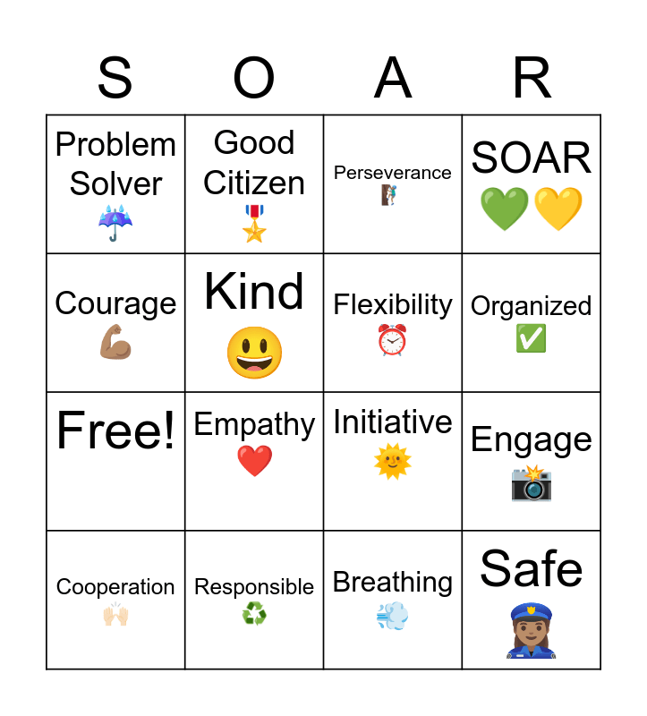 This bingo card has 20 words: Engage 📸, Eagles 🦅, Perseverance 🧗🏽♂️, Inspire 🚀, Cooperation 🙌🏻, Courage 💪🏽, Responsible ♻️, Problem Solver ☔️, Free!, Good Citizen 🎖, Empathy ❤️, Initiative 🌞, Kind 😃, Safe 👮🏽♀️, Flexibility ⏰, Honesty ⚽️🏀, Organized ✅, SOAR 💚💛, Breathing 💨 and Mindful 🧠.