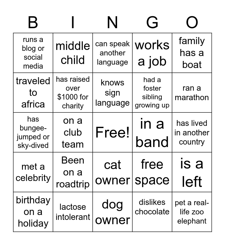 This bingo card has a free space and 25 words: Been on a roadtrip, dog owner, knows sign language, birthday on a holiday, family has a boat, runs a blog or social media, traveled to africa, middle child, in a band, cat owner, had a foster sibling growing up, has bungee-jumped or sky-dived, free space, is a left, has raised over $1000 for charity, been scuba diving, has lived in another country, can speak another language, ran a marathon, on a club team, pet a real-life zoo elephant, lactose intolerant, met a celebrity, works a job and dislikes chocolate.