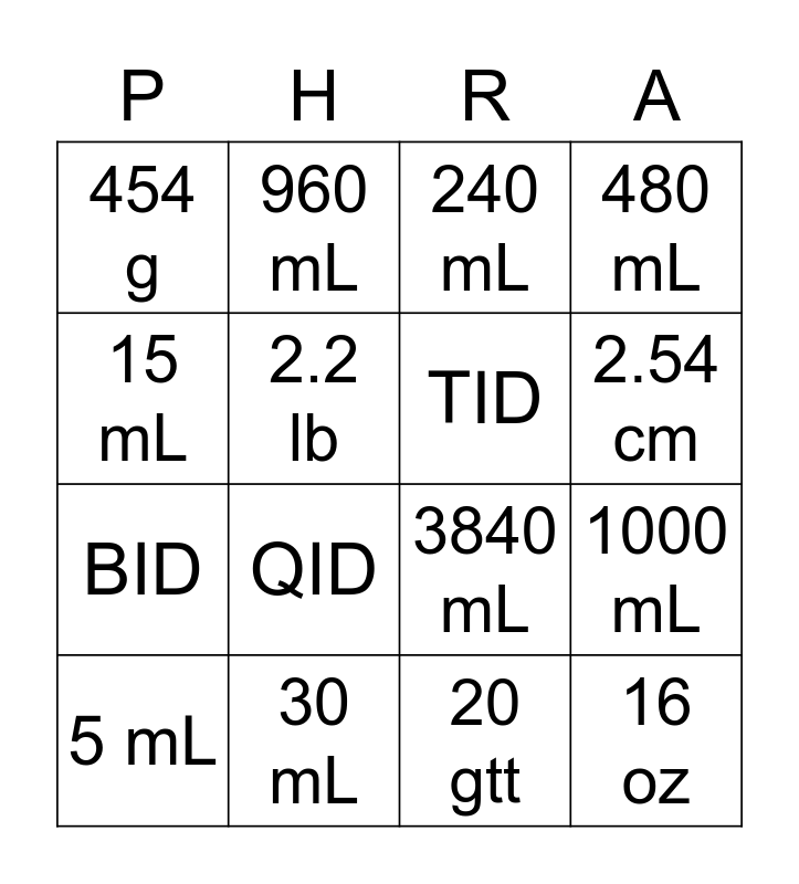 This bingo card has 16 words: 5 mL, 30 mL, 240 mL, 480 mL, 15 mL, 960 mL, 3840 mL, 1000 mL, 454 g, 2.2 lb, 20 gtt, 2.54 cm, BID, QID, TID and 16 oz.