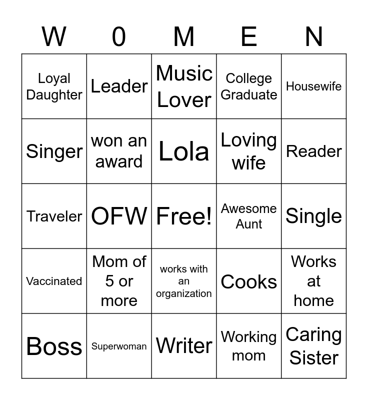 This bingo card has a free space and 24 words: Mom of 5 or more, Superwoman, Lola, Boss, Housewife, Loyal Daughter, Singer, Leader, Awesome Aunt, works with an organization, Loving wife, Traveler, Cooks, Works at home, won an award, Working mom, Single, Music Lover, Reader, OFW, Caring Sister, Vaccinated, College Graduate and Writer.
