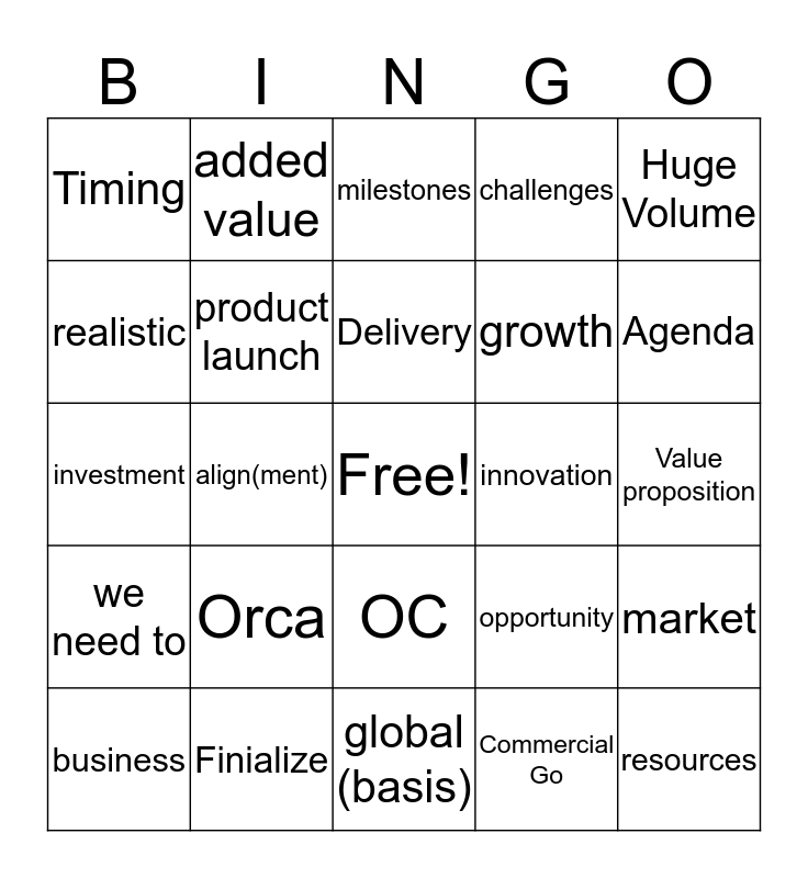 This bingo card has a free space and 26 words: OC, Commercial Go, Delivery, Finialize, Huge Volume, Timing, realistic, added value, Value proposition, opportunity, growth, investment, market, business, align(ment), priorities, challenges, we need to, milestones, resources, Agenda, global (basis), innovation, Orca, product launch and successful.