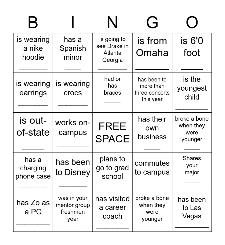 This bingo card has a free space and 86 words: shares birthdays with you _____, is a twin ______, plans to go to grad school _____, is afraid of heights _____, has 3 siblings ____, plans to take summer classes _____, shares your same shoe size _____, has never been on an airplane _______, prefers pepsi over coca-cola _____, has studied abroad _____, traveled during their Spring Break ________, Is younger than you _____, Shares your major _____, broke a bone when they were younger _____, wears contacts ____, had or has braces _____, has traveled to two countries _______, Is older than you _____, enjoys reading books _____, is majoring in Biology _____, is part of a fraternity/sorority _________, speaks three languages _____, is out-of-state ____, is left-handed _____, broke a bone when they were younger ________, dislikes sushi ____, enjoys playing video games _________, lives on-campus _______, plays the flute _______, is in a class with you ______, was in your mentor group freshmen year _______, find a PC ______, find a UA ____, has been to Disney ______, is wearing earrings _______, plays a sport at UNL _______, is the youngest child ________, is the oldest child ________, has freckles _____, works on-campus _______, has two jobs ____, drives a honda civic _____, is in the Husker Marching Band ____, has their own business ____, is the middle child ______, is 6'0 foot ____, has two majors ____, has a Spanish minor ____, has tattoos ____, has a nose piercing ______, is a WHT peer mentor _____, is part of a WHT intramural _______, has a charging phone case ________, is from Minnesota _______, drives a white truck ______, dislikes Hawaiian pizza _______, favorite artist is Drake _______, has been to more than three concerts this year ________, is from Omaha ______, is wearing crocs _______, is wearing a nike hoodie _______, is wearing converse ________, is wearing Husker paraphernalia ___________, is wearing WHT paraphernalia __________, is wearing a beanie _________, is going to see Drake in Atlanta Georgia _________, is going to see Taylor Swift this summer __________, has been to Las Vegas _________, has Adrienne as a PC _______, has Preston as a PC _________, has Fern as a PC ________, has Precious as a PC __________, has Zo as a PC ________, has an internship for the summer __________, is wearing a red hoodie ________, did cheer in high school ________, has visited a career coach ________, is a tutor as the WHT study cafe __________, has been to France ________, is lactose intolerant _______, has been to Alaska _______, lives in the Court Yards _______, knows how to play chess ________, has over 1k followers on TikTok ___________, commutes to campus ________ and is majoring in Graphic Design _______.