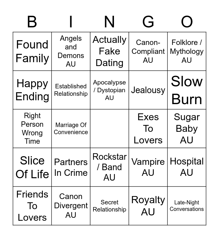 This bingo card has a free space and 85 words: 3+1 / 5+1 Things, Acts Of Service, Actually Fake Dating, Angst With A Happy Ending, Bad Flirting, Banter / Bickering, Based On Other Media, Character Study, Childhood Friends, Childhood Friends To Lovers, Confessions, Didn't Know They Were Dating, Established Relationship, Exes To Lovers, Fake Relationship, Found Family, Friends To Lovers, Happy Ending, Humor, Hurt/Comfort, Idiots To Lovers, Jealousy, Late-Night Conversations, Love Languages, Marriage Of Convenience, Morally Gray Characters, Mutual Pining, Not Actually Unrequited Love, Only One Bed, Opposites Attract, Partners In Crime, Pining, Polyamory, Right Person Wrong Time, Romcom, Roommates, Secret Relationship, Sharing Dreams, Slice Of Life, Slow Burn, Soulmates, Strangers To Lovers, Stuck Together / Forced Proximity, Time Loop, Trope Subversion, Unrequited Love, Unrequited Rivalry, Very Obvious A Very Oblivious B, We Kissed Once But We Don't Talk About It, Wound Tending, Angels and Demons AU, Apocalypse / Dystopian AU, Bakery AU, Boarding School AU, Bodyguard AU, Buzzfeed Unsolved AU, Canon Divergent AU, Canon-Compliant AU, Coffee Shop AU, College / University AU, Crime / Criminals AU, Cyberpunk AU, Dark Academia AU, Fantasy AU, Florist x Tattoo Artist AU, Folklore / Mythology AU, Heist AU, Hospital AU, Hybrid AU, Lawyers AU, Magical AU, Modern With Magic AU, Non-Idol Celebrity AU, Office AU, Road Trip AU, Rockstar / Band AU, Royalty AU, Science Fiction AU, Sports AU, Spy AU, Sugar Baby AU, Superpowers / Superhero AU, Urban Fantasy AU, Vampire AU and Wedding Planner AU.
