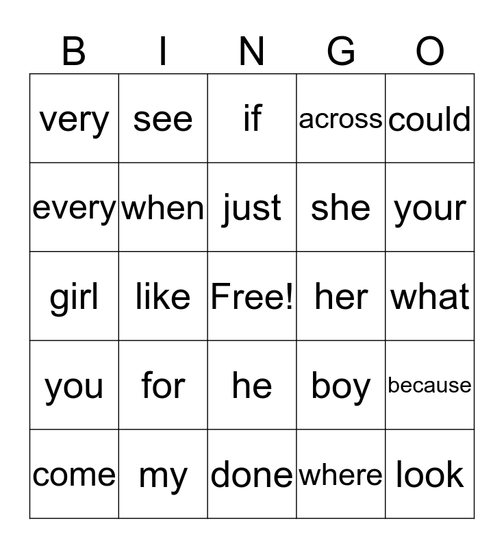 This bingo card has a free space and 24 words: for, my, just, come, could, very, every, see, her, he, she, girl, boy, because, when, where, what, if, your, like, look, you, across and done.