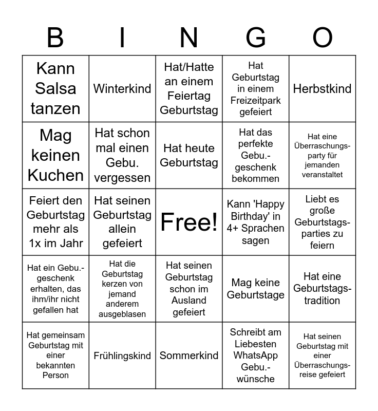 This bingo card has a free space and 24 words: Hat die Geburtstag kerzen von jemand anderem ausgeblasen, Frühlingskind, Hat heute Geburtstag, Hat gemeinsam Geburtstag mit einer bekannten Person, Herbstkind, Kann Salsa tanzen, Mag keinen Kuchen, Winterkind, Kann 'Happy Birthday' in 4+ Sprachen sagen, Hat seinen Geburtstag schon im Ausland gefeiert, Hat das perfekte Gebu.-geschenk bekommen, Feiert den Geburtstag mehr als 1x im Jahr, Mag keine Geburtstage, Hat eine Geburtstags-tradition, Hat schon mal einen Gebu. vergessen, Schreibt am Liebesten WhatsApp Gebu.-wünsche, Liebt es große Geburtstags-parties zu feiern, Hat/Hatte an einem Feiertag Geburtstag, Hat eine Überraschungs-party für jemanden veranstaltet, Hat seinen Geburtstag allein gefeiert, Hat seinen Geburtstag mit einer Überraschungs-reise gefeiert, Hat ein Gebu.-geschenk erhalten, das ihm/ihr nicht gefallen hat, Hat Geburtstag in einem Freizeitpark gefeiert and Sommerkind.