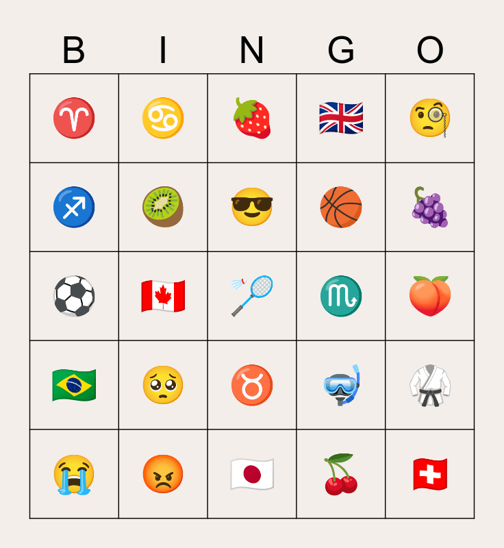 This bingo card has a free space and 24 words: π₯Ί, π‘, π, π, π§, β, β, β, β, β, π, β½, π€Ώ, π₯, π₯, π, π, π, π, π¨π¦, π¨π, π§π·, π¬π§ and π―π΅.