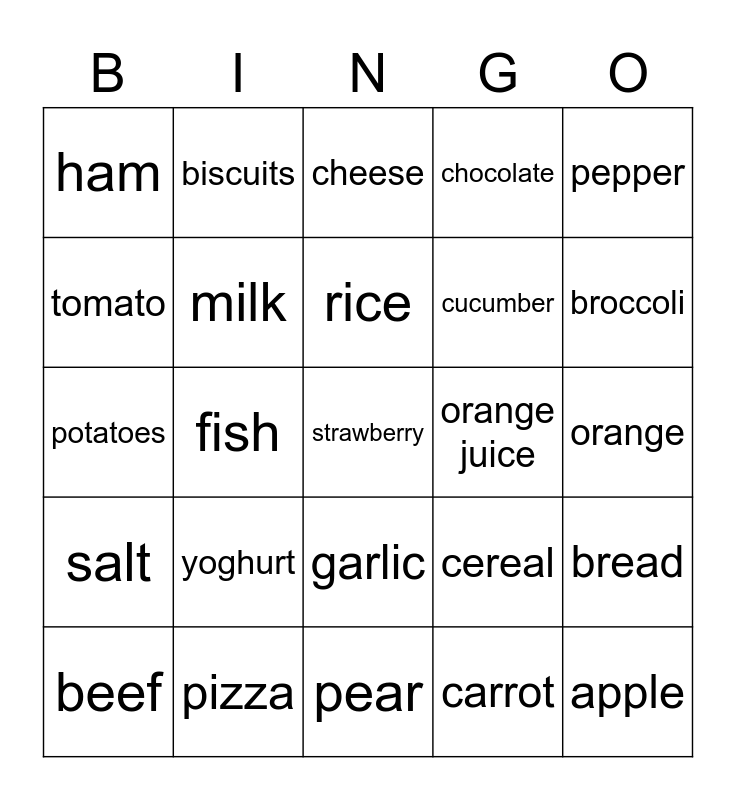 This bingo card has a free space and 29 words: beef, chicken, fish, pork, ham, cheese, milk, yoghurt, orange juice, pizza, orange, apple, pear, carrot, broccoli, cauliflower, garlic, salt, pepper, potatoes, cereal, lettuce, cucumber, tomato, chocolate, biscuits, bread, rice and lentils.