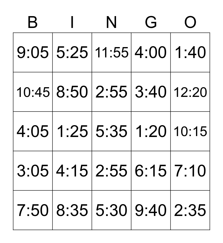 This bingo card has a free space and 24 words: 4:15, 8:35, 2:55, 7:50, 1:40, 9:05, 10:45, 5:25, 1:20, 2:55, 3:40, 4:05, 6:15, 7:10, 8:50, 9:40, 10:15, 11:55, 12:20, 1:25, 2:35, 3:05, 4:00 and 5:30.