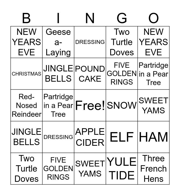⚠ This card has duplicate items: CHRISTMAS (2), JINGLE BELLS (2), HAM (2), DRESSING (2), POUND CAKE (2), SNOW (2), NEW YEARS EVE (2), FIVE GOLDEN RINGS (2), Partridge in a Pear Tree (2), Two Turtle Doves (2), Three French Hens (2), SWEET YAMS (2)