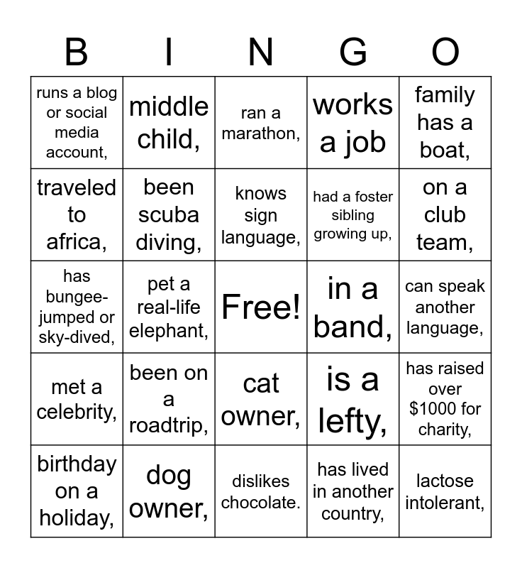 This bingo card has a free space and 24 words: been on a roadtrip,, dog owner,, knows sign language,, birthday on a holiday,, family has a boat,, runs a blog or social media account,, traveled to africa,, middle child,, in a band,, cat owner,, had a foster sibling growing up,, has bungee-jumped or sky-dived,, is a lefty,, has raised over $1000 for charity,, been scuba diving,, has lived in another country,, can speak another language,, ran a marathon,, on a club team,, pet a real-life elephant,, lactose intolerant,, met a celebrity,, works a job and dislikes chocolate..