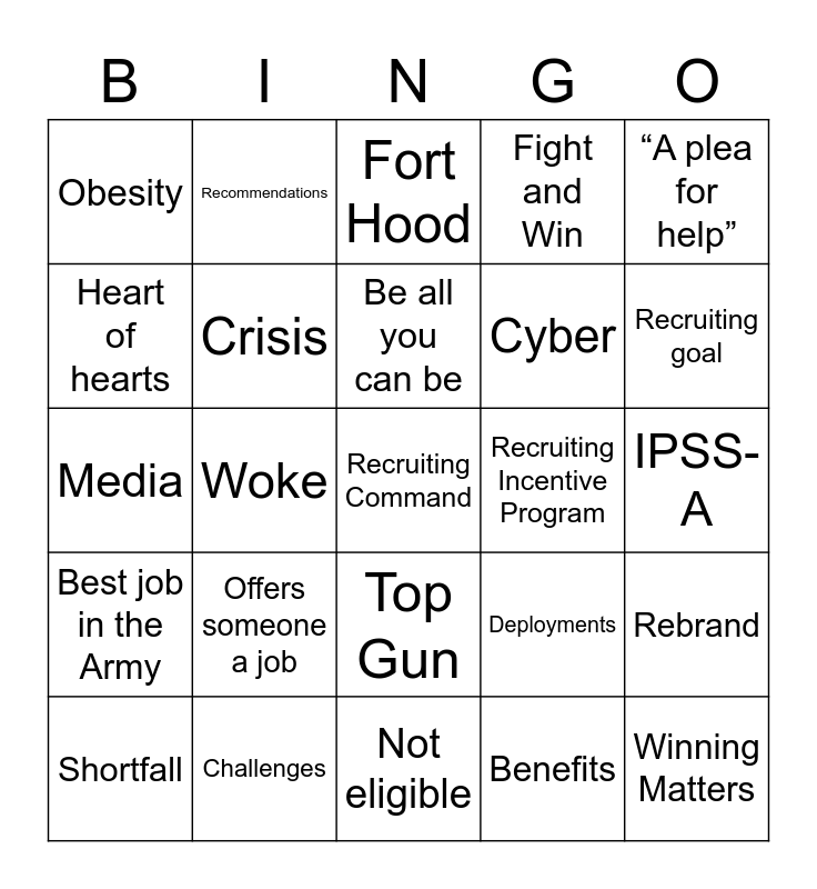 This bingo card has a free space and 38 words: Retention, Gen-Z, Millennials, Crisis, Rebrand, Offers someone a job, Be all you can be, Connect, “A plea for help”, Cyber, Woke, Fight and Win, Winning Matters, IPSS-A, Heart of hearts, Best job in the Army, Majors, Fort Hood, All volunteer force, Recruiting Incentive Program, Obesity, Challenges, Recruiting goal, Shortfall, Young people, Not eligible, COVID, Lifeblood, Physical Fitness, Marketing, Commercial, Top Gun, Benefits, Recommendations, ROTC, Deployments, Media and Leadership.