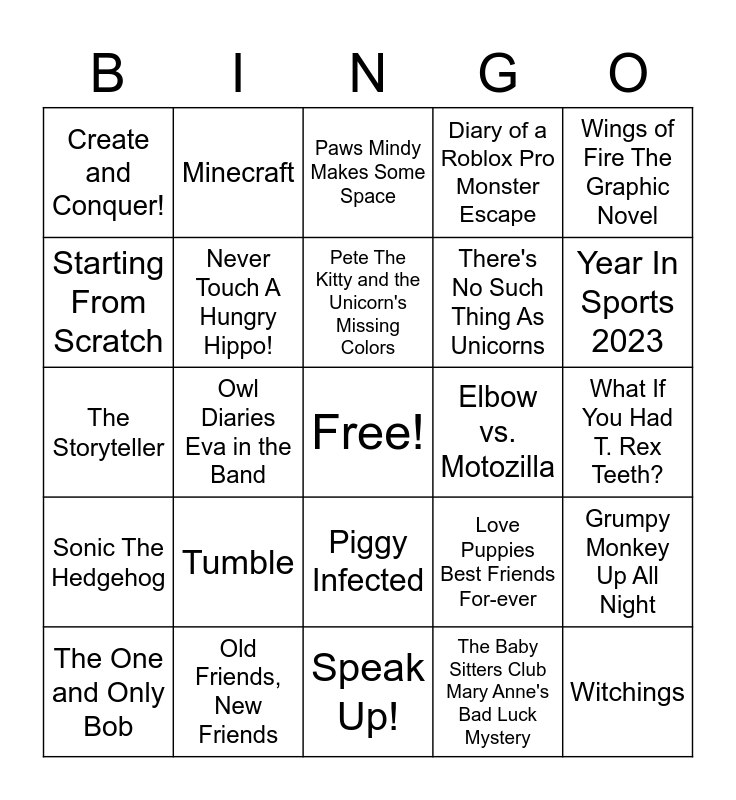 This bingo card has a free space and 24 words: Tumble, Old Friends, New Friends, Pete The Kitty and the Unicorn's Missing Colors, The One and Only Bob, Wings of Fire The Graphic Novel, Create and Conquer!, Starting From Scratch, Minecraft, Elbow vs. Motozilla, Piggy Infected, There's No Such Thing As Unicorns, The Storyteller, Love Puppies Best Friends For-ever, Grumpy Monkey Up All Night, Never Touch A Hungry Hippo!, The Baby Sitters Club Mary Anne's Bad Luck Mystery, What If You Had T. Rex Teeth?, Paws Mindy Makes Some Space, Year In Sports 2023, Owl Diaries Eva in the Band, Witchings, Sonic The Hedgehog, Diary of a Roblox Pro Monster Escape and Speak Up!.
