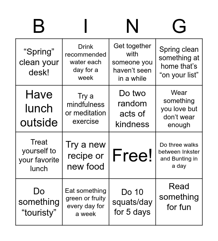 This bingo card has 19 words: Free!, Go for a walk in a park, Get together with someone you haven’t seen in a while, Read something for fun, Do three walks between Inkster and Bunting in a day, Have lunch outside, Do 10 squats/day for 5 days, “Spring” clean your desk!, Drink recommended water each day for a week, Treat yourself to your favorite lunch, Try a new recipe or new food, Try a mindfulness or meditation exercise, Do two random acts of kindness, Eat something green or fruity every day for a week, Do something “touristy”, Do 60 second wallsits for 5 days in a week, Spring clean something at home that’s “on your list”, Wear something you love but don’t wear enough and Do something fun!.