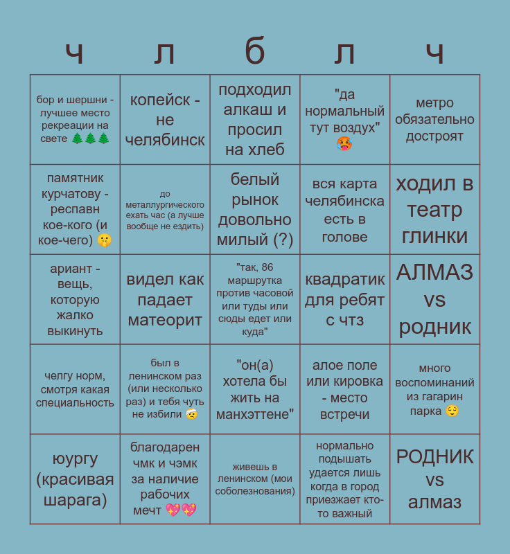 This bingo card has 25 words: был в ленинском раз (или несколько раз) и тебя чуть не избили 🤕, живешь в ленинском (мои соболезнования), белый рынок довольно милый (?), юургу (красивая шарага), метро обязательно достроят, бор и шершни - лучшее место рекреации на свете 🌲🌲🌲, памятник курчатову - респавн кое-кого (и кое-чего) 🤫, копейск - не челябинск, квадратик для ребят с чтз, "он(а) хотела бы жить на манхэттене", вся карта челябинска есть в голове, ариант - вещь, которую жалко выкинуть, алое поле или кировка - место встречи, много воспоминаний из гагарин парка 😌, до металлургического ехать час (а лучше вообще не ездить), РОДНИК vs алмаз, АЛМАЗ vs родник, подходил алкаш и просил на хлеб, ходил в театр глинки, видел как падает матеорит, "так, 86 маршрутка против часовой или туды или сюды едет или куда", благодарен чмк и чэмк за наличие рабочих мечт 💖💖, челгу норм, смотря какая специальность, "да нормальный тут воздух" 🥵 and нормально подышать удается лишь когда в город приезжает кто-то важный.