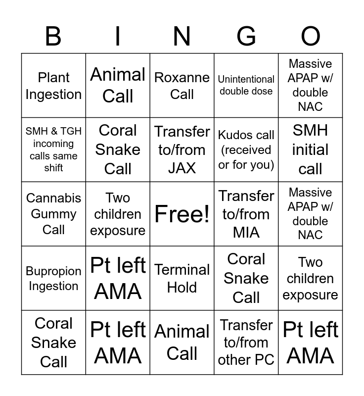 ⚠ This card has duplicate items: Plant Ingestion (3), Pt left AMA (3), Massive APAP w/ double NAC (3), Bupropion Ingestion (3), Roxanne Call (3), Coral Snake Call (3), Two children exposure (3), Kudos call (received or for you) (3), Cannabis Gummy Call (3), Unintentional double dose (3), Took spouses meds (3), Melatonin exposure (3), Mushroom ID (3), Transfer to/from JAX (2), Transfer to/from MIA (2), SMH initial call (2), TGH incoming call (2), Terminal Hold (2), Red Tide Call (2), Animal Call (2), Call from EMS/911 (2), Food poisoning call (2)