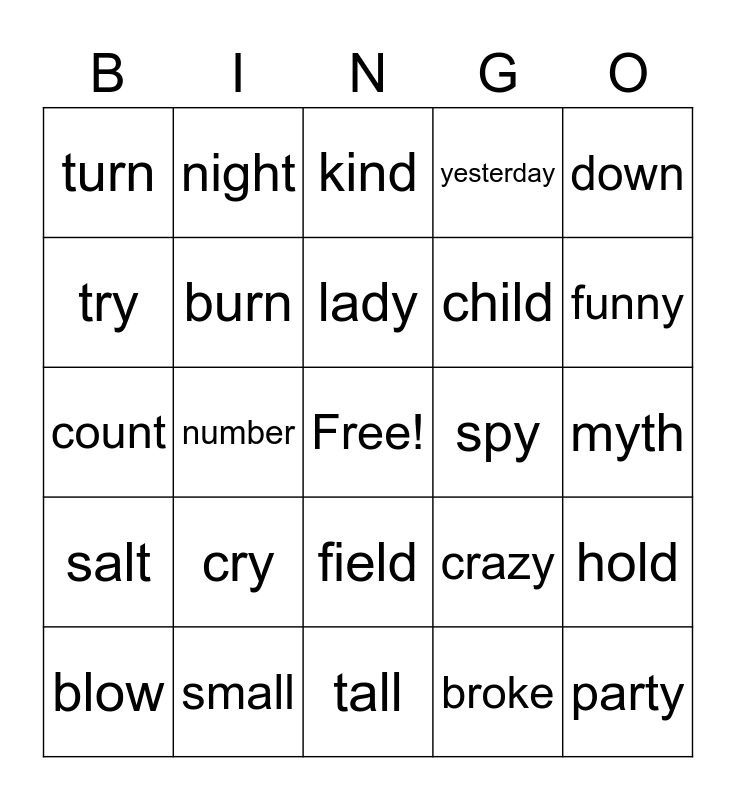 This bingo card has a free space and 25 words: cry, tall, lady, blow, down, turn, try, night, spy, field, child, count, crazy, hold, burn, first, myth, kind, funny, number, party, small, salt, yesterday and broke.